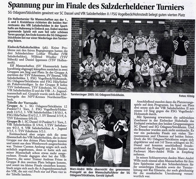 Der beste Torschütze des Turniers Sven Kensy ( 6 Treffer ) führte unsere Mannschaft mit 4 Siegen bei einer Niederlage und nur einem Gegentor zum Gruppensieg und damit ins Endspiel. Finalgegner SC Dassel konzentrierte sich zu sehr auf Sven, was der im Endpiel überragende Gerold Uphoff mit einem tollen Solo und und einem satten Schuß, sowie Turan Özdogan mit einem weiteren Treffer zum 3:0 Endstand nutzten. Unsere Mannschaft spielte mit: TW Ekrem Hitaj, Patrick Thunrey, Sylvester Lukomski, Gerold Uphoff ( 2 Tore ), Turan Özdogan (1), Karsten Sander, Adnan Quiskaj (1), Sven Kensy (6) und Tobias Hildebrandt. Einziger Wehmutstropfen: Wir hätten gern noch etwas gefeiert.... |