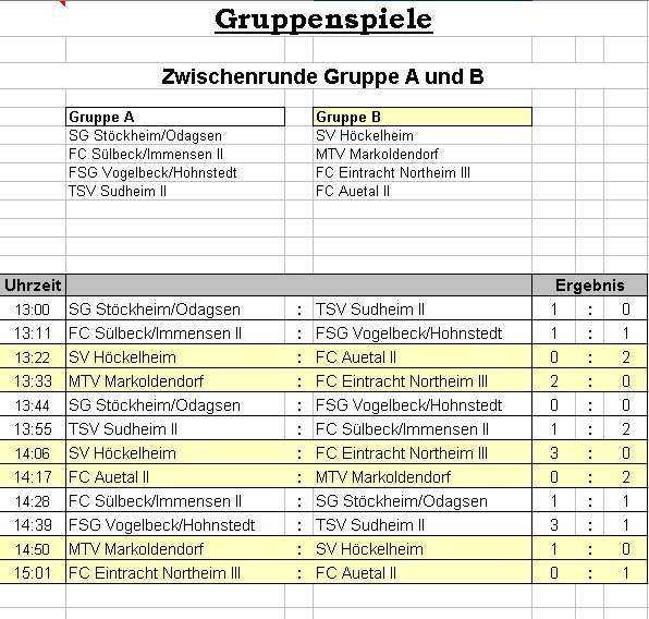 Der schon in der Vorrunde ungeschlagene MTV Markoldendorf liess sich in Zwischenrundengruppe B nicht die Butter vom Brot nehmen, steigerte sich noch einmal gegenüber der Vorrunde und bezwang alle drei anderen Teams ohne Gegentor mit spielerisch überzeugenden Leistungen. Der FC Auetal erreichte das kleine Finale mit Siegen gegen den SV Höckelheim und der dritten Mannschaft des FC Eintracht Northeim, die auch noch gegen Höckelheim den kürzeren zogen