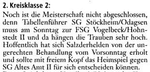 Am 14.05.2006 in Stöckheim gegen den VfR Salzderhelden 2:1 Der Gast aus Salzderhelden ging bereits in der 1. Minute in Führung als zwei Gästespieler völlig frei im Strafraum waren. Unsere Mannschaft mühte sich und kämpfte auch, konnte sich aber im 1. Durchgang nur wenige zwingende Chancen erspielen. Nach der Pause erhöhte unsere Mannschaft den Druck immer mehr, erspielte und erkämpfte sich mehr Chancen, aber Salzderhelden blieb immer gefährlich. In der 80. Minute gab es Handelfmeter für uns und A. La Rocca ließ dem Gästekeeper keine Chance. Endlich der Ausgleich. In der 88. Minute vereitelte Keeper R. Golkowski die erneute Gästeführung. Eine Minute später forderten die Gäste Elfmeter, den unmittelbar darauffolgenden Konter über K. Sander und N. Spangenberg nutzte wieder A. La Rocca, der die Hereingabe vor dem Gästekeeper eiskalt ins Tor spitzelte, zum 2:1 . Die Gäste protestierten vehement, aber der Treffer galt. Dabei blieb es bis zum Schlußpfiff. |